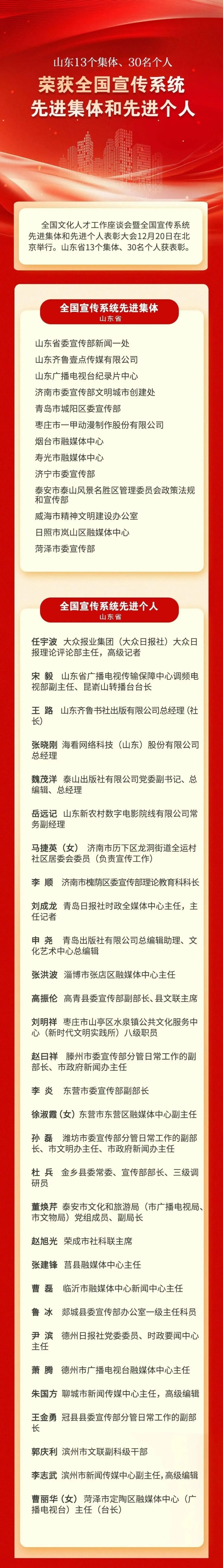 12月20日,全国文化人才工作座谈会暨全国宣传系统先进集体和先进个人表彰大会在北京举行。山东省在此次高规格表彰中表现突出,共有13个集体和...