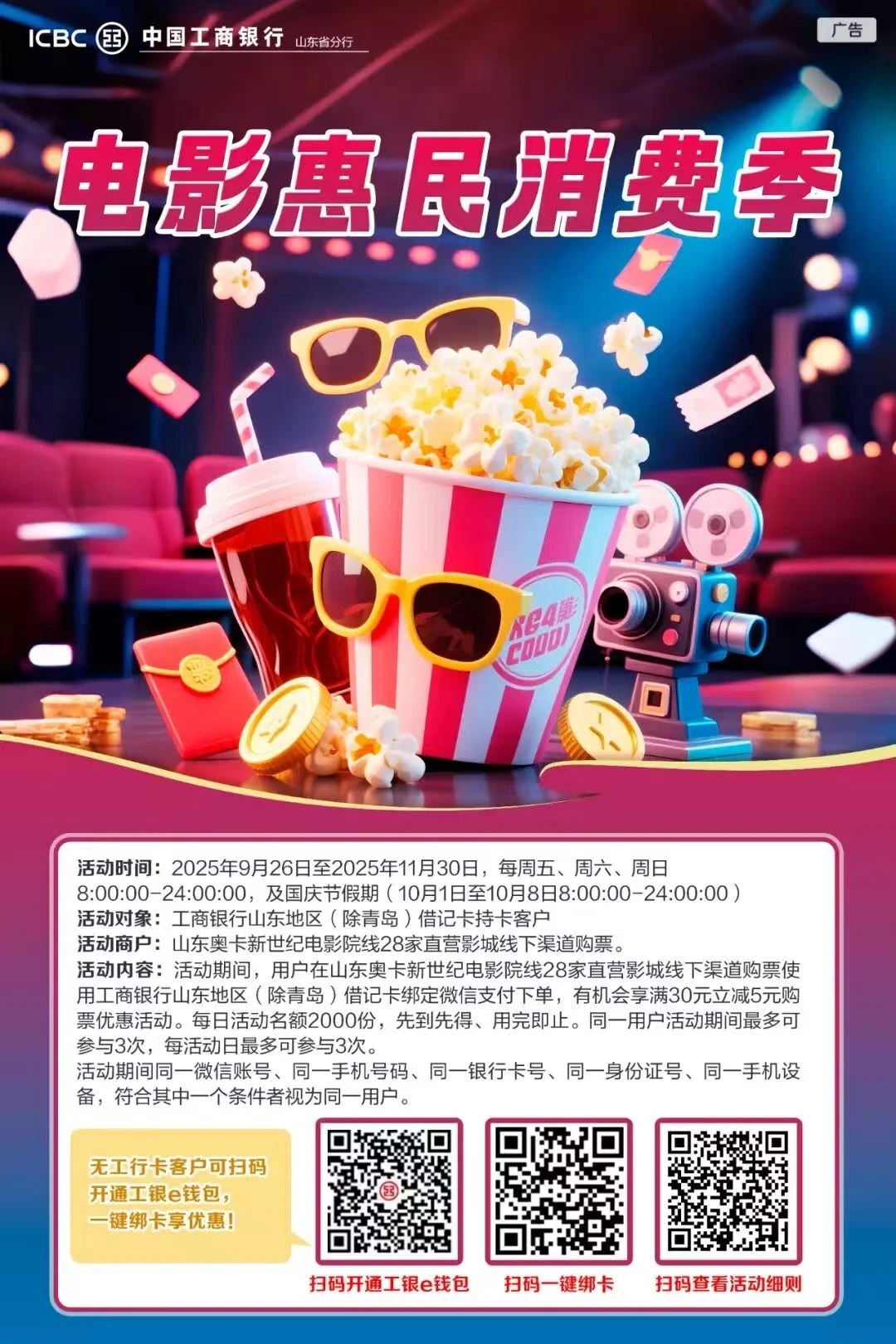 活动一:活动时间:2025年9月26日至2025年11月30日,每周五、周六、周日优惠内容:刷工行借记卡购票,满30立减5元。活动对象:工商银行山东地区(除青岛)借记卡持卡客户注意...