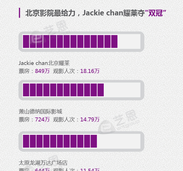 在月度票房TOP10影院中,北京市表现亮眼,占据4席,除Jackie chan北京耀莱夺得票房、人次冠军外,金逸国际影城(北京朝阳大悦城店)、北京金逸影城荟聚店、首都华融电影院上榜。