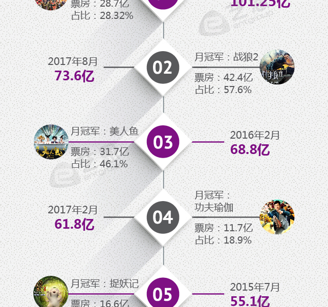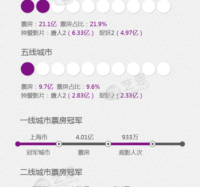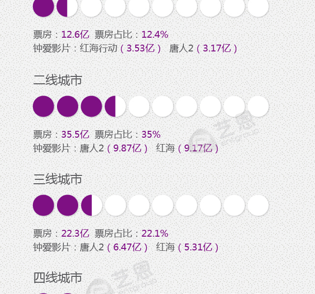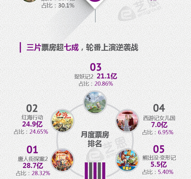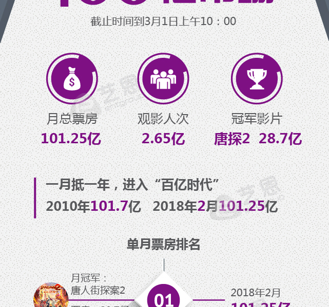 在分析中,我们仍然可以清晰看到各级城市中观众对于影片的偏爱,在观影最成熟的一级城市中,凭口碑逆袭而上的《红海行动》成为观众最爱,《唐人街探案2》紧随其后;二、三级城市的“口味”相近,他们选择最多的是《唐人街探案2》和《红海行动》;下沉至四、五城市后,“合家欢”型影片更受偏爱,《捉妖记2》替代《红海行动》上升至第二位。101.25亿,这是2018年2月份的月度票房,2010年,全年的票房数据是101.7亿!
