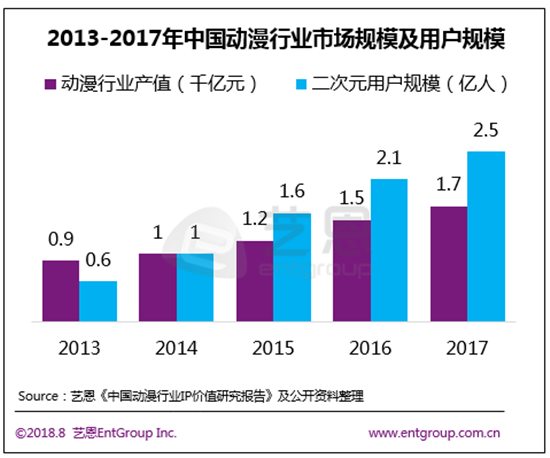 根据艺恩观察,近年来,我国动漫行业发展迅速,市场规模及用户规模持续快速上升,2017年动漫行业产值突破1700亿,泛二次元用户规模超2.5亿,其中核心二次元用户规模超8000万,约60%的二次元用户属于“90后”、“00后”,“9000岁”成为二次元用户主力军。