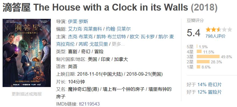 同样是儿童奇幻冒险电影,《滴答屋》显然缺乏和《胡桃夹子和四个王国》正面刚的底气,比后者提前一天上映,大概是想赶一波万圣节的热度。
