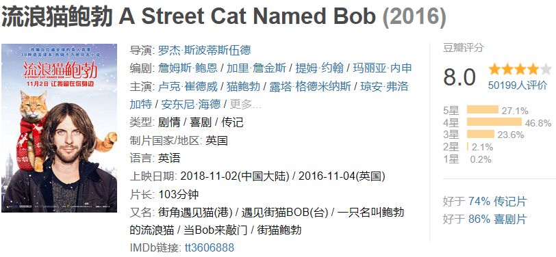 后来,詹姆斯在街头卖艺,猫鲍勃寸步不离,很快他俩就成了网红,詹姆斯收获了爱情,和父亲和解,还出了书,然后被改编成电影,从人渣晋升人生赢家。