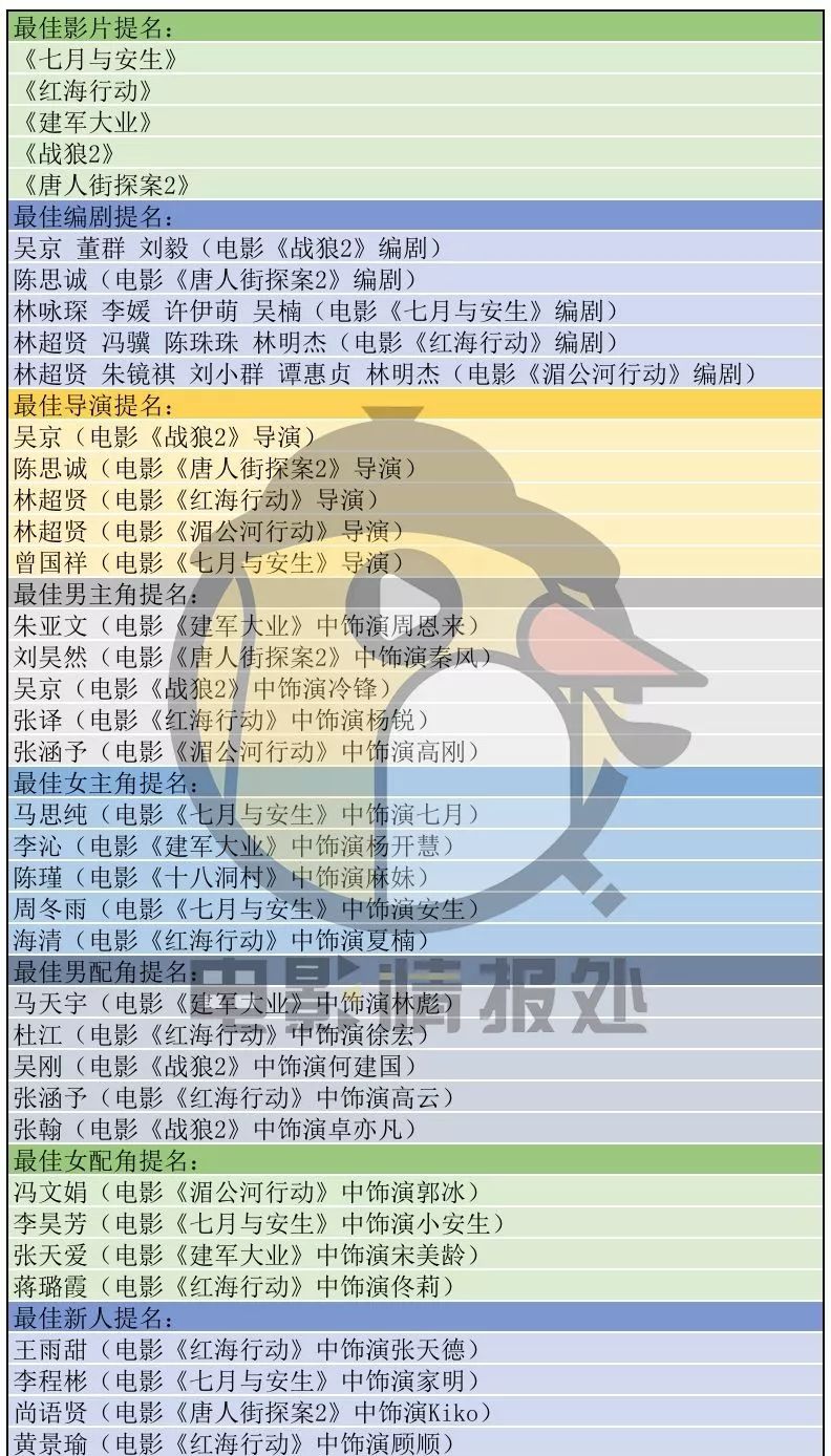 多少让大家遗憾的是,之前被大家所看好,在香港电影金像奖和台湾电影金马奖上有多项提名的《芳华》未能入选,今年春节档票房火爆的《唐人街探案2》则提名了多项奖项。