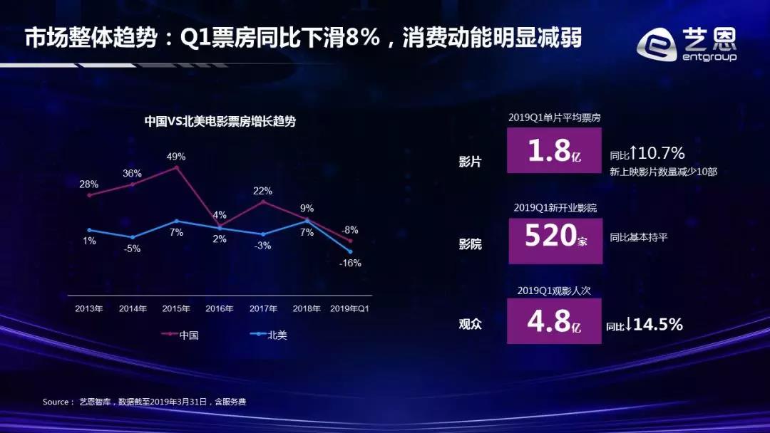 付亚龙首先对2019年第一季度的电影票房情况做了总结。他指出,2019年Q1票房同比下降8%。新增影院方面,则基本与去年同期持平。
