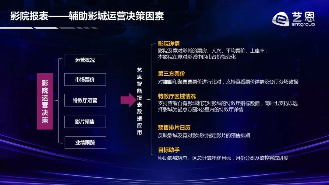 关于影院智能报表产品,付亚龙重点介绍了影院拓展和运营决策两个模块功能。“影院拓展”模块主要为影投院线前期投资并购等行为提供强大的数据支撑,从周边的基本配置(商圈,交通,人流)到区域影院近年走势,再到直接竞对的发展现状等数据信息及分析。“运营决策”模块主要为为影投院线包括影院的运营部门提供日/周/月/年甚至每日不同时段等维度下的数据报表,第三方票价对比,竞对及自身的第三方票价、特效厅数据、排片周期表,还有年终目标助手等功能,帮助影院对自家影城运营概况、市场票价、自家和竞对特效厅运营、影片预售情况以及业绩情况等进行实时跟踪和分析。艺恩影院智能报表支持一键导出,解决相关数据资料用人工收集整理分析维度不全数据不准确、耗时耗力等问题。