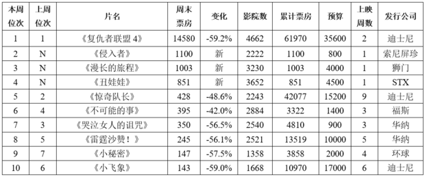 《复联4》轻松蝉联北美周末票房冠军,几部填档的新片实力则相对薄弱,三部新片的开画预期都在千万美元左右。