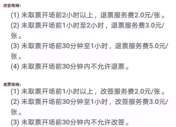 相比淘票票,猫眼的“退改签”规定更为笼统,取票用户放映前0分钟均可以办理退票和改签,服务费没有明确说明。大众点评和猫眼的标准几乎一致。