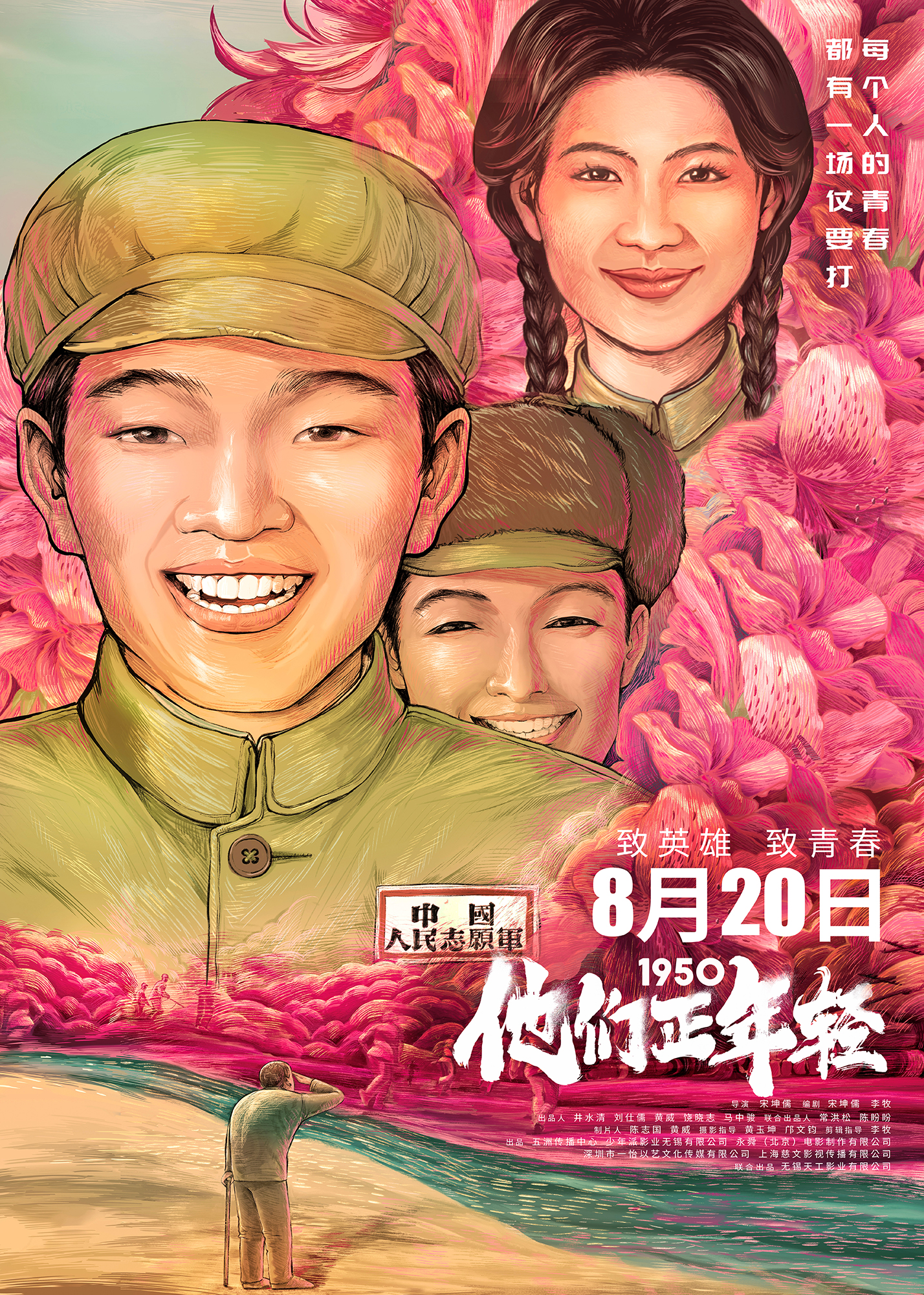 由宋坤儒执导的抗美援朝纪录电影 《1950他们正年轻》今日曝光“正年轻”版手绘海报,海报中,一条鸭绿江将岁月分隔,上方三位年轻的志愿军战士笑脸纯真,背后盛开的金达莱花鲜艳夺目,海报的下方一位老人在行军礼,如同在向自己过往的青春岁月致敬。影片将于8月20日于全国影院上映。