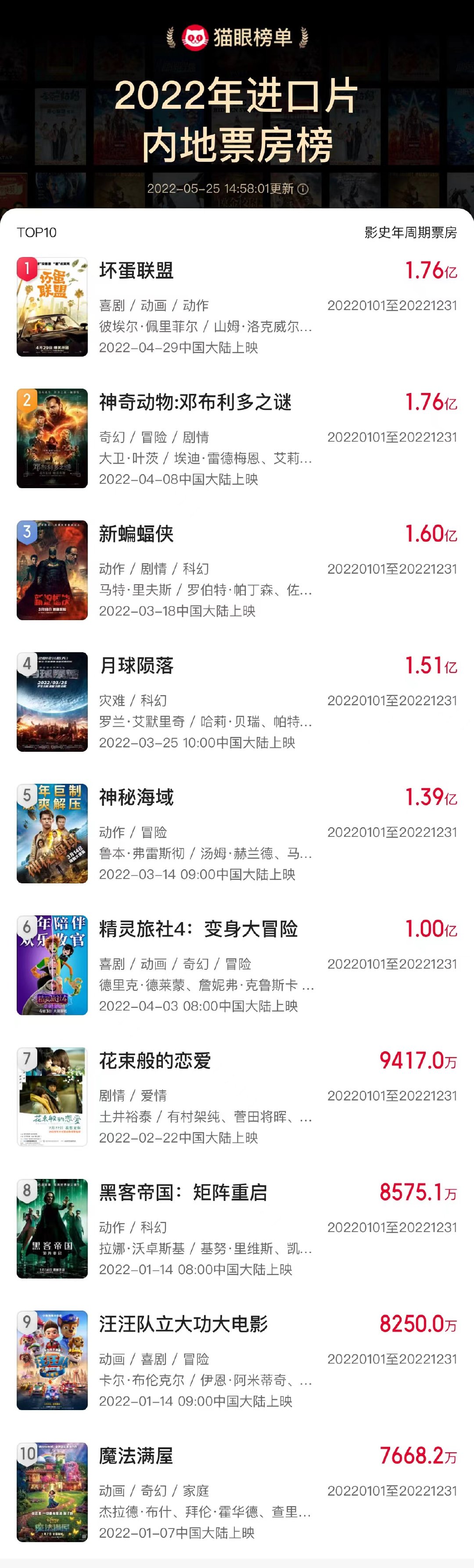 据猫眼专业版,截止今天5月25日15时,梦工厂动画电影《坏蛋联盟》内地总票房超1.76亿,超过《神奇动物3》成2022年内地上映进口片票房榜、人次榜冠军!