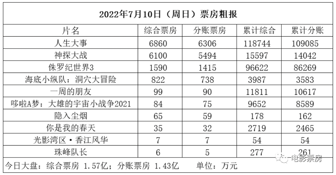 7月10日(周日),全国共排36.7万场,观影人次约405.5万,根据初步统计产出票房1.57亿。