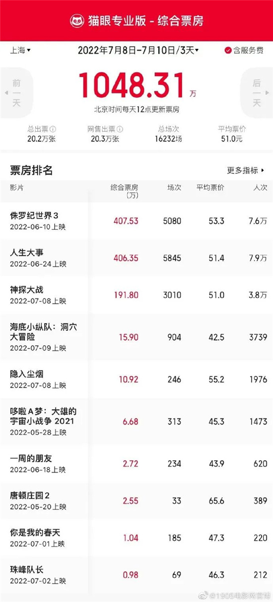 据统计,上海复工首周票房(7月8日至7月10日)为1048.31万元,位居全国城市票房榜第8位,总人次20.2万,总场次1.6万。其中,《侏罗纪世界3》、《人生大事》、《神探大战》,分别以407.53万元、406.35万元、191.80万元票房,成为上海复工首周周票房前三。