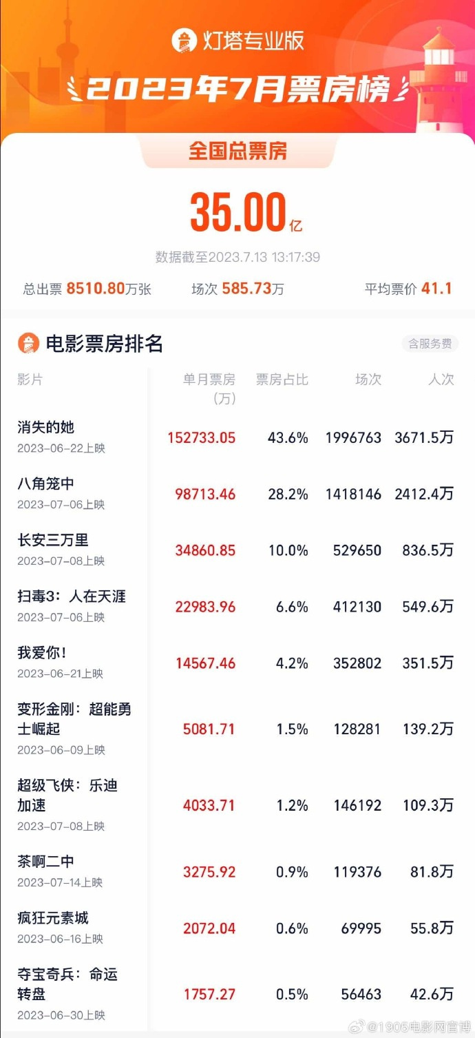 据灯塔专业数据显示,截至7月13日13时17分,2023年7月(7月1日-7月31日)全国总票房(含预售)突破35亿,累计观影人次超8500万,电影《消失的她》《八角笼中》《长安三万里》暂列本月票房前三位。