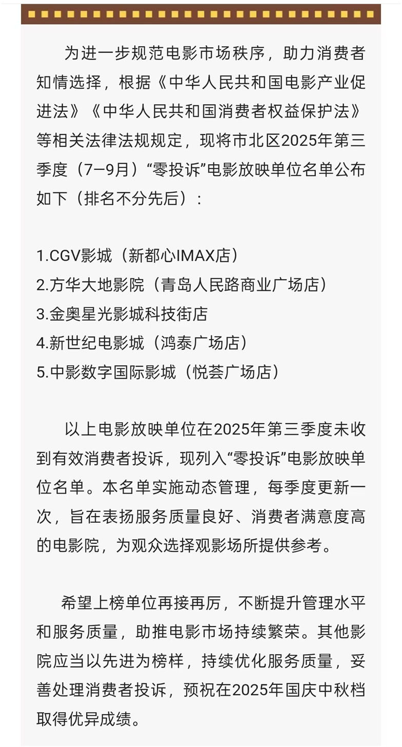 在消费体验日益受到重视的今天,“零投诉”不仅仅是一个简单的数据,它是一座服务殿堂的基石,是衡量品质与诚意的金线。近日,青岛市北区文化和旅游局通过其官方平台发布的一则表彰通报,便将这份沉甸甸的荣誉,授予了新世纪电影城(鸿泰广场店)——该影城在2023年7月至9月这整整一个季度里,实现了服务“零投诉”的卓越成就,被官方誉为“服务品质的行业标杆”。 0