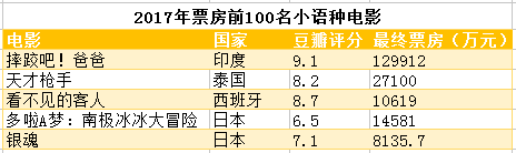 从2017年全国电影票房年报中,我们可以看出,在票房前100名的电影中,除了传统的国产电影和好莱坞大片之外,小语种电影一方面在数量上大势上扬,另一方面,也取得了较好的票房和口碑。