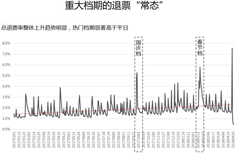第七,之前线上购票率没有这么高,线下买票基本不能退票。线上购票普及后,退票也没有立刻普及,很多影院不支持,随着越来越多的影院支持退票(目前猫眼上有6000多家影院支持线上退改签),退票率逐渐上升也很正常。