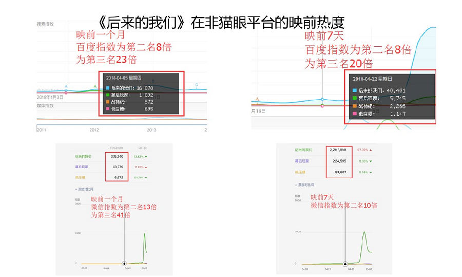 康利表示,《后来的我们》本身就是一部热度很高的电影,不仅仅是在猫眼热度高,上映之前的百度指数、微博和微信热度都很高。
