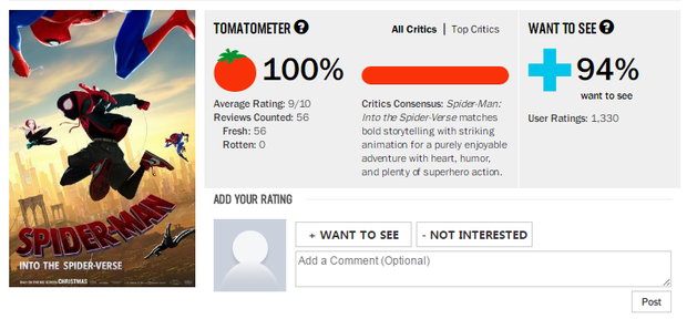 《蜘蛛侠:平行宇宙》将于本月14号在北美地区开画,影片口碑居高不下,目前影片在烂番茄网站的新鲜度高达100%。