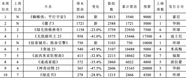 索尼影业出品的漫改动画片《蜘蛛侠:平行宇宙》首周末登陆北美3800多家影院开画,开画三天进账3540万美元,如预期将周末冠军揽入囊中。该片不但成为继《超人总动员2》后,今年第二部开画夺冠的超级英雄题材动画作品,也接棒《无敌破坏王2》,连续第四周代表动画电影统治北美市场。