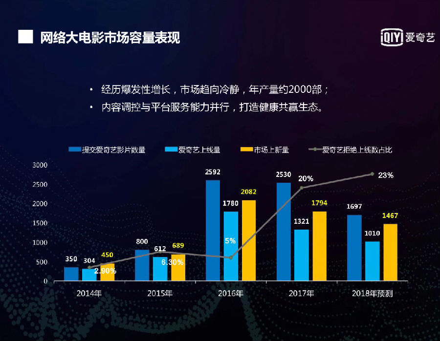 根据葛旭峰的分享,过去一年,提交爱奇艺的影片数量为1697部,而爱奇艺上线的预测为1010部。不仅是爱奇艺,作为网大市场的另外两个主力军——优酷和腾讯,上线数量也相对平缓。