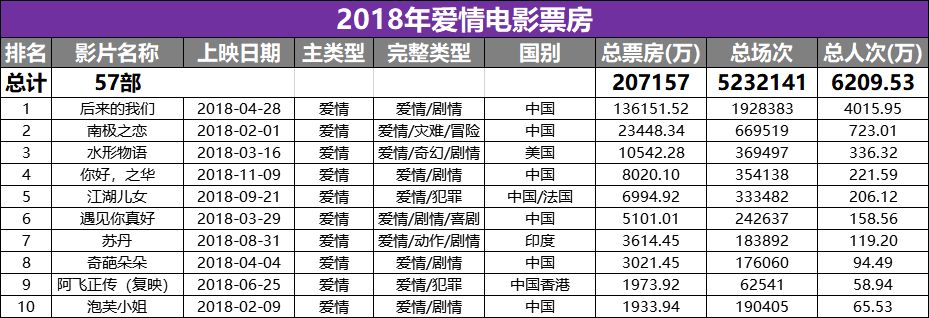 纵观票房排名前十的爱情电影,可以清晰地感受到观众品味的改变。2017年《喜欢你》《傲娇与偏见》《春娇救志明》这类主角纯谈恋爱的影片还比较受观众喜欢,到了2018年观众则更偏向《南极之恋》《水形物语》《江湖儿女》这类多元素杂糅的爱情电影。
