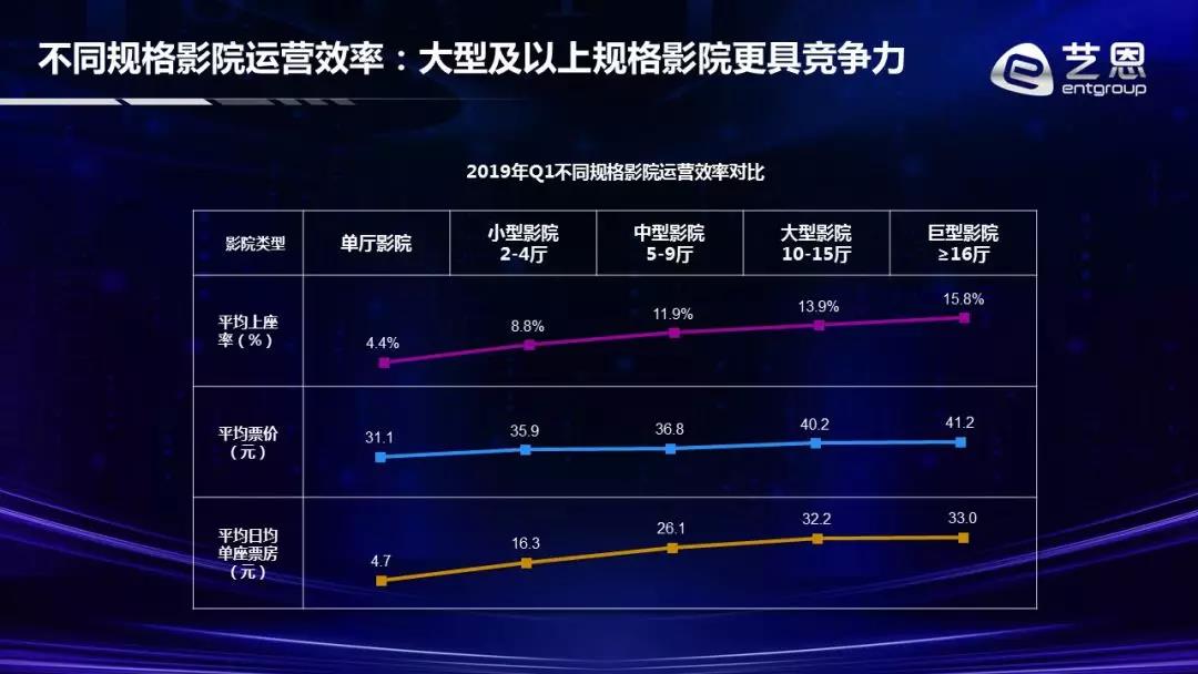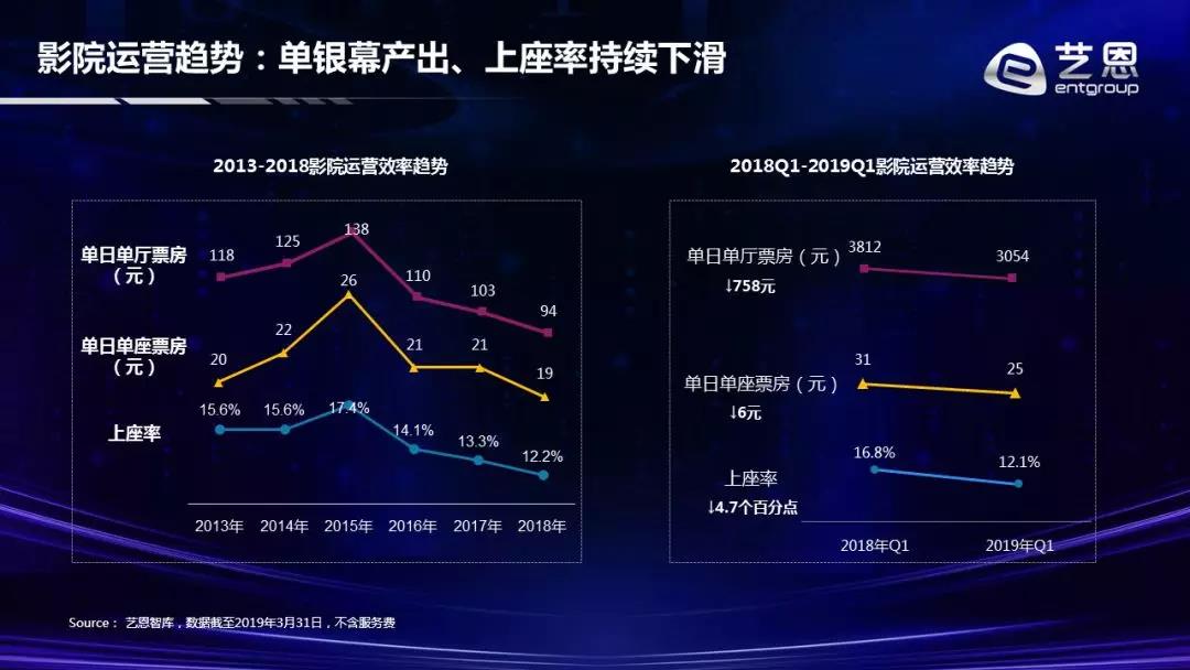 而在影院运营效率方面,2019Q1单日单厅收入下降了758元,单日单座收入下滑6元。票房占城镇消费品零售总额的比例从0.29%下滑到了0.26%,票房下沉趋势也在2019Q1放缓,三四五线城市票房占比多年来首次下降。各种数据表明,2019年第一季度的中国电影市场并不乐观。