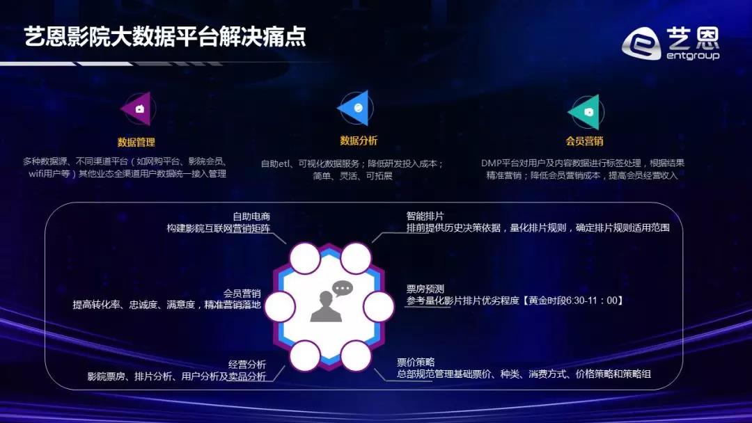 艺恩影院大数据平台主要解决大型影院投资管理公司的私有数据资产管理及挖掘应用问题,付亚龙重点介绍了影院运营当中关于数据管理、经营分析、会员营销等三个方面的痛点,以及相应的产品功能模块。