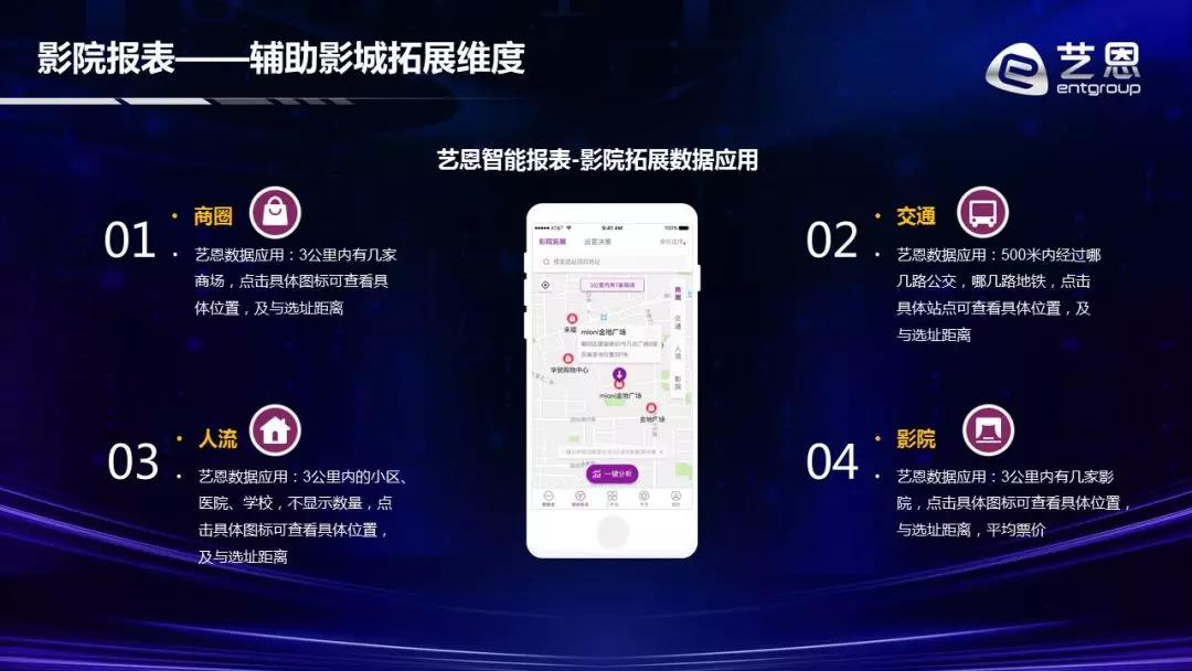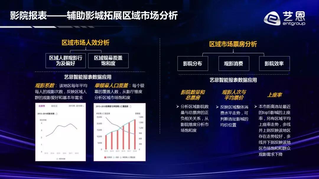关于影院智能报表产品,付亚龙重点介绍了影院拓展和运营决策两个模块功能。“影院拓展”模块主要为影投院线前期投资并购等行为提供强大的数据支撑,从周边的基本配置(商圈,交通,人流)到区域影院近年走势,再到直接竞对的发展现状等数据信息及分析。“运营决策”模块主要为为影投院线包括影院的运营部门提供日/周/月/年甚至每日不同时段等维度下的数据报表,第三方票价对比,竞对及自身的第三方票价、特效厅数据、排片周期表,还有年终目标助手等功能,帮助影院对自家影城运营概况、市场票价、自家和竞对特效厅运营、影片预售情况以及业绩情况等进行实时跟踪和分析。艺恩影院智能报表支持一键导出,解决相关数据资料用人工收集整理分析维度不全数据不准确、耗时耗力等问题。