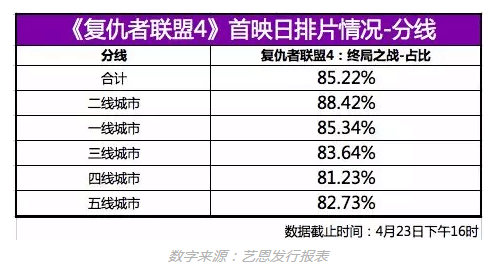 同样根据艺恩相关数据显示,《复联4》首映日排片中二线城市占比最高,为88.42%,即便是比较下沉的四、五线城市,首映日的排片占比也均超过了80%。