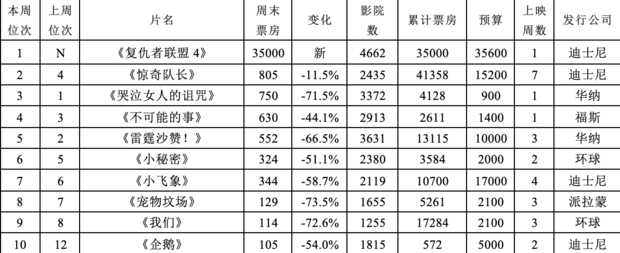 同为迪士尼发行的《惊奇队长》是唯一得到《复联4》开画加成的影片,仅比前一周末小跌一成左右,回升至周末票房榜亚军。