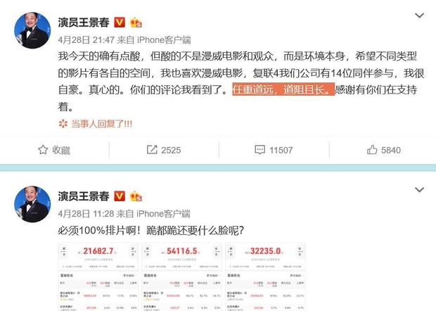 4月28日,凭借《地久天长》获得新晋柏林影帝的王景春在微博发文,言辞相当激烈:“(《复联4》)必须100%排片啊!跪都跪还要什么脸呢?”后来王景春又说,“我酸的不是漫威电影和观众,而是环境本身,希望不同类型的影片有各自的空间,任重道远,道阻且长。”
