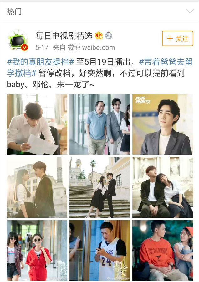 与此同时,其他文娱市场发生着许多微妙的变化。原定于5月19日在东方卫视、浙江卫视以及优爱腾同步播出的《带着爸爸去留学》在开播前两天被紧急撤档。由杨颖、邓伦、朱一龙主演的都市剧《我的真朋友》提档播出,在被撤档之前,《带着爸爸去留学》的众主创已经宣传了多日。由此可见,对于这部剧的撤档,无论是片方还是播出平台都准备不足。