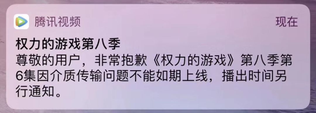 无独有偶,尽管在内容上已经做了“阉割”,经典美剧《权力的游戏》第八季得以顺利在腾讯视频播出。然而,这则长青树美剧却有可能面临无法“善终”的命运。近期,腾讯视频用户接到一则提醒通知,内容大意为该剧第八季第6集因为介质传输问题不能如期上线,播出时间另行通知。截至当前,官方对于具体播出时间仍未公布。