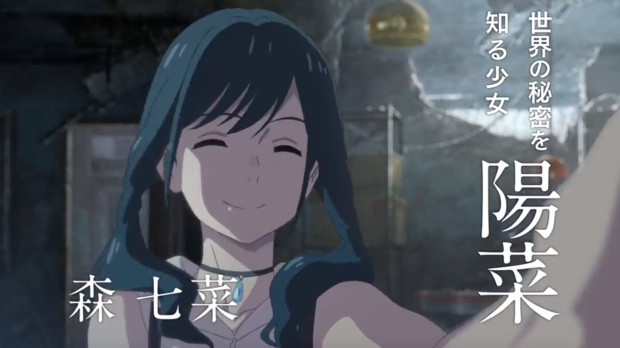 森七菜配音女主角阳菜,她拥有不可思议的魔力,能通过“祈祷”让天空变晴朗。在城市的一角, 帆高与阳菜相遇了。