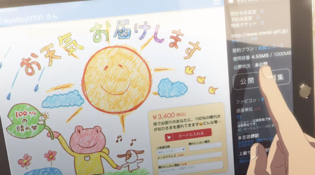 预告中,在不停下雨的东京,帆高与阳菜相遇了,他发现阳菜是“百分百晴天女孩”,当她双手合十的时候,雨滴会飞上云端,地球被太阳笼罩。