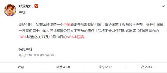 随着莫雷事件的继续发酵,即将举行的2019年NBA中国赛也因此受到影响。今天凌晨,多位中国赛受邀艺人嘉宾宣布退出球迷之夜和中国赛相关活动。目前宣布退出的包括UNINE、郑云龙、范丞丞、李易峰、白敬亭、吴谨言,他们通过所在的工作室、资讯站或者本人官方微博相继发出声明,表示将会坚持一个中国原则,维护祖国统一,并表示将会退出在10月9日举办的“NBA球迷之夜”以及NBA中国赛。