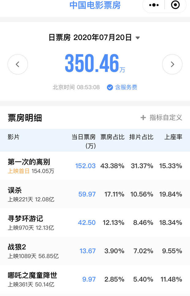 时光网讯 根据电资办数据,7月20日低风险地区的电影院迎来恢复营业第一天,首日全国票房超过350万、出票超13.8万张,排片为8600多场。新片《第一次的离别》票房152万领跑,重映老片中《误杀》获得约60万票房。