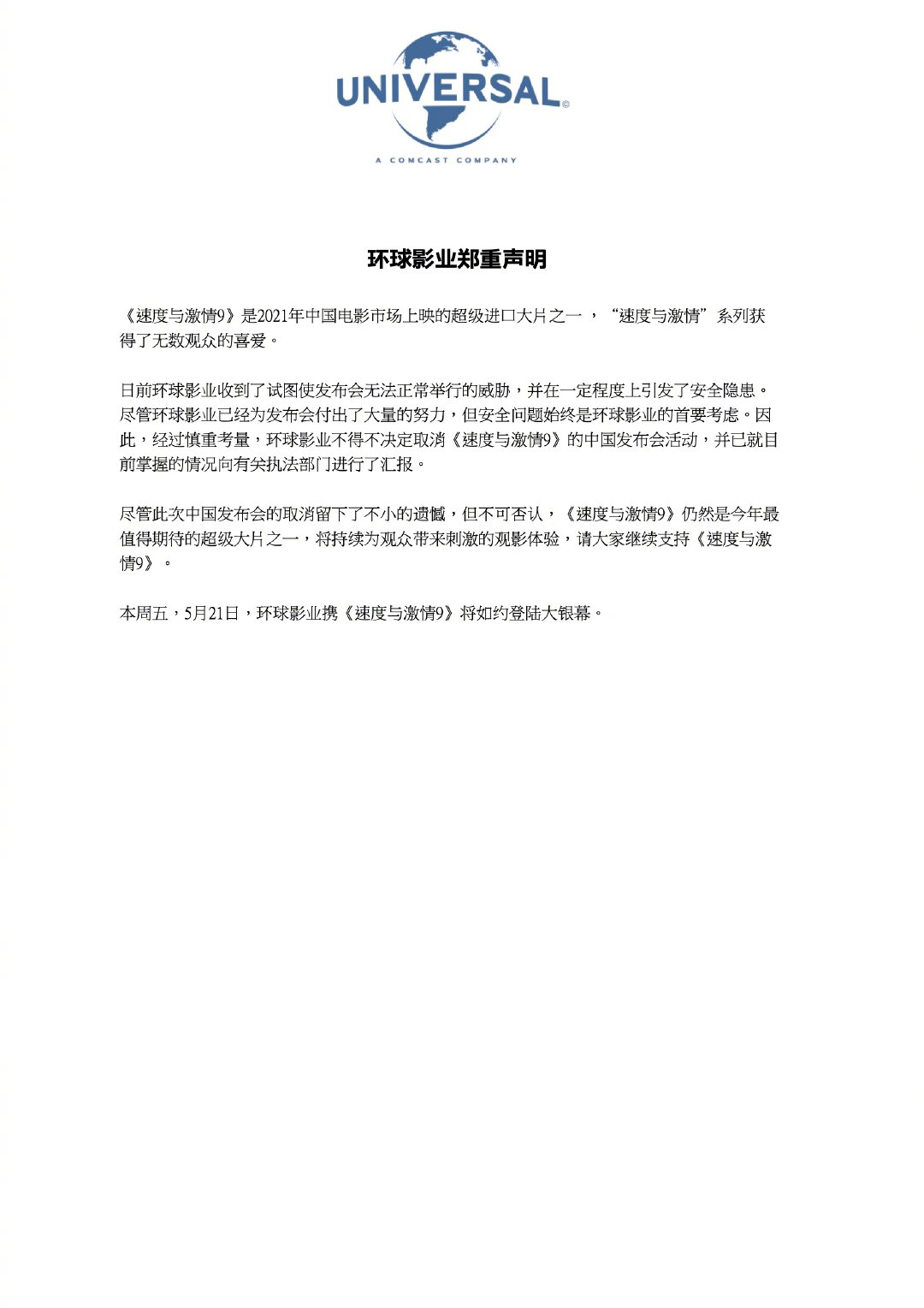 时光网讯 今日,环球影业发布声明,称原定今天举行的《速度与激情9》中国发布会活动取消,原因是“环球影业收到了试图使发布会无法正常举行的威胁,并在一定程度上引发了安全隐患。”环球影业称已经向有关执法部门进行了汇报。