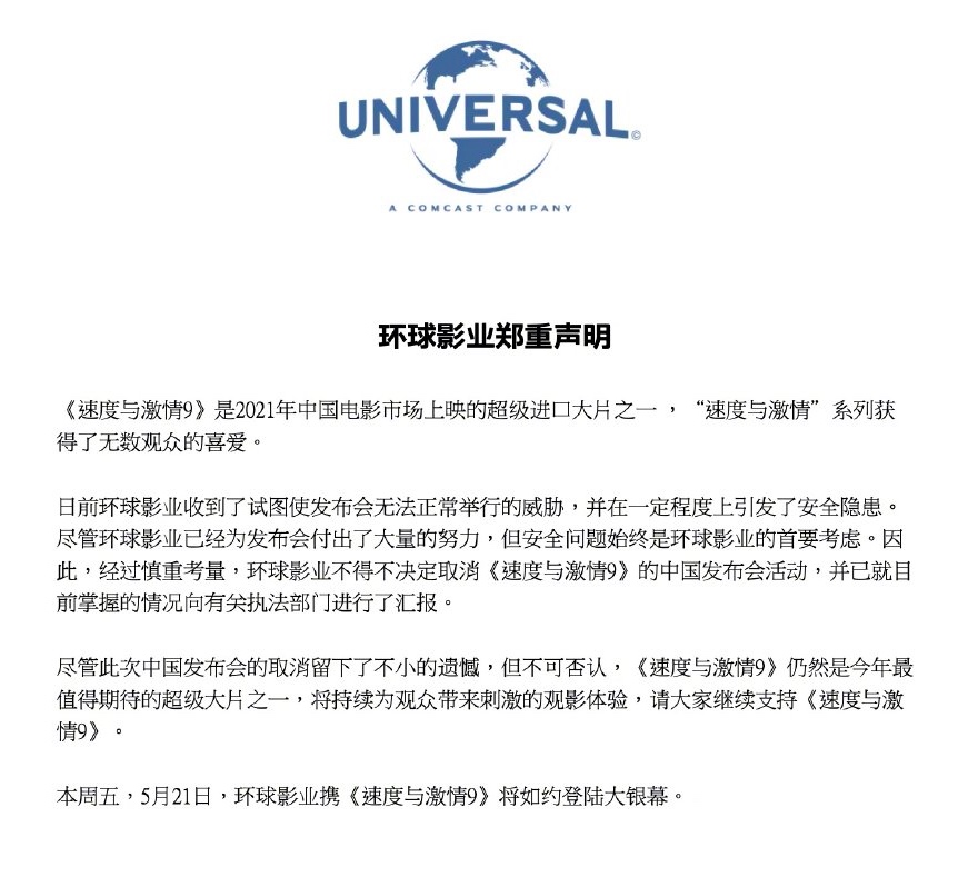 环球影业发布声明,称原定昨日举行的《速度与激情9》中国发布会活动取消,原因是“环球影业收到了试图使发布会无法正常举行的威胁,并在一定程度上引发了安全隐患。”环球影业称已经向有关执法部门进行了汇报。 影片将于5月21日正常上映。