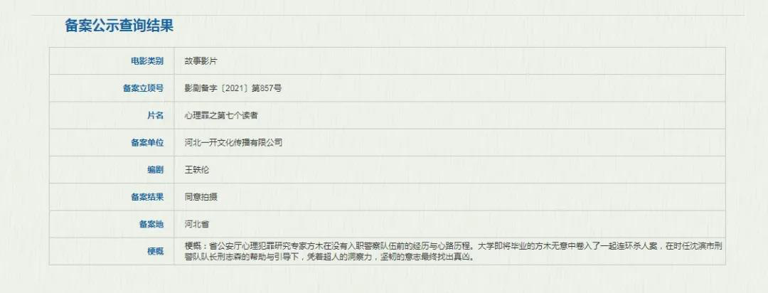 《心理罪之第七个读者》是系列小说的前传,从故事梗概来看,影片将忠于原著内容,讲述心理犯罪研究专家方木调查一起发生在大学男生宿舍里的连环凶杀案。