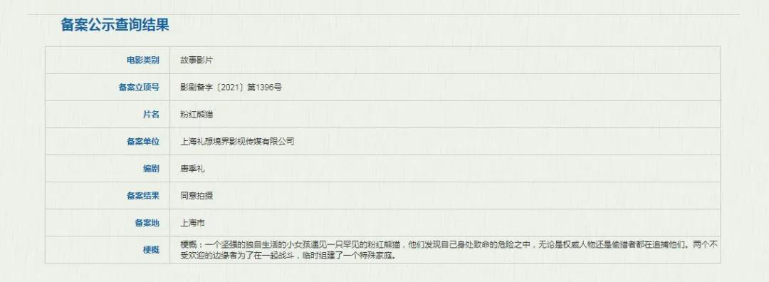 在去年北影节的市场签约项目上,也公布了一个由唐季礼执导、正在开发的项目《熊猫特工》,是一部以国宝大熊猫被盗猎后辗转多个国家展开剧情的冒险电影。到底《熊猫特工》和《粉红熊猫》有什么关系,是不是同一部电影,都有待进一步消息确认。