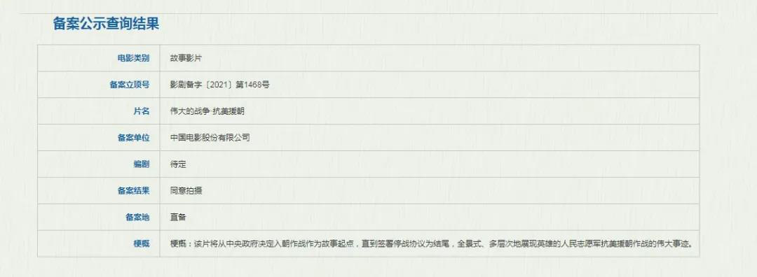 中影备案的电影《伟大的战争·抗美援朝》将是继《金刚川》《长津湖》《狙击手》后又一部抗美援朝题材的新主流大片。