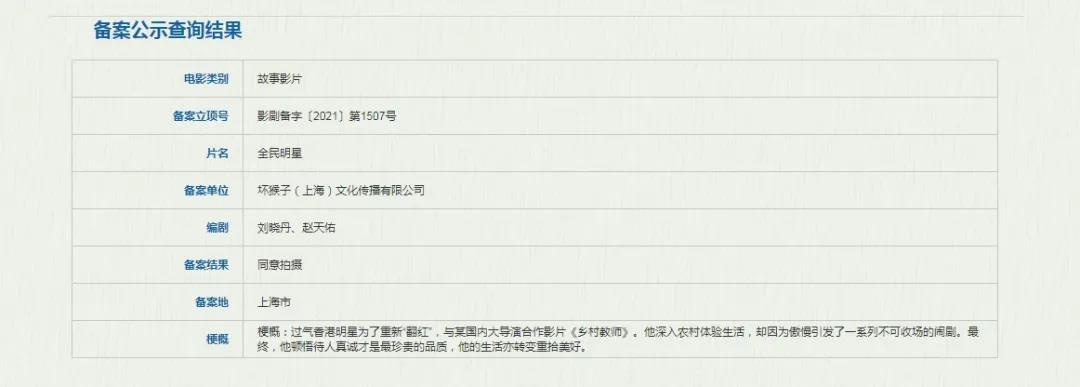 坏猴子影业在今年上影节期间就召开发布会官宣《全民明星》,宁浩现场透露电影剧本已经写完第一稿。
