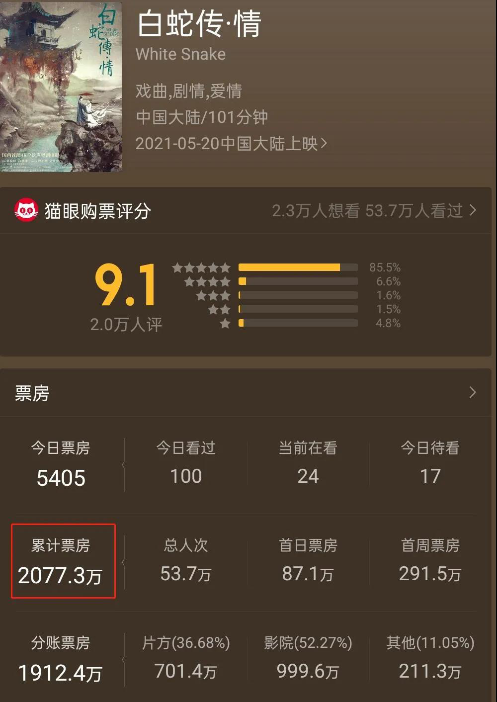 粤剧电影《白蛇传·情》超2000万的票房可以说是今年令人颇为惊讶的小黑马。一部戏曲影片,又是仅流行在广东一带的粤剧,竟然能在全国范围内获得这样的票房,不得不让人感叹,《白蛇传》真的是家喻户晓,魅力不减。