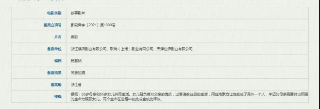 《春潮》导演杨荔钠也正在续写她的“女性三部曲”,第二部电影《春歌》近期已经成功备案立项。据梗概介绍,主角是两个年迈的女性,85岁母亲照顾65岁患有阿兹海默症的女儿,两人彼此成全彼此辉映。