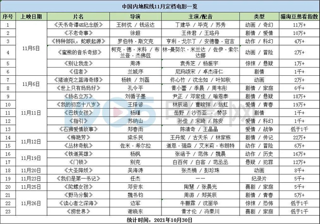 截至目前,11月将有超过20部电影上映,整体数量不多,进口片也少,有《特种部队:蛇眼起源》《蜜熊的音乐奇旅》《丛林奇航》三部,预计之后还会有一些国内外新片宣布定档在11月。