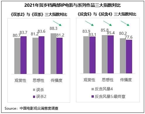 两部IP系列影片《误杀2》、《反贪风暴5:最终章》满意度分别为83.2分、82.7分,居档期第四、第五位。与历史调查的同系列影片相比,这两部影片的满意度表现不尽如人意,较前一部作品均有所下降。IP影片具备良好的受众基础,但同时也意味着更高的期待和要求。《误杀2》在前作拉高观众期待后,虽然影片在观赏性、思想性创作上仍保持较高水准,但观众传播意愿却较前作大幅下滑;《反贪风暴5:最终章》与前作相比,则是三大指数评分全面下滑。