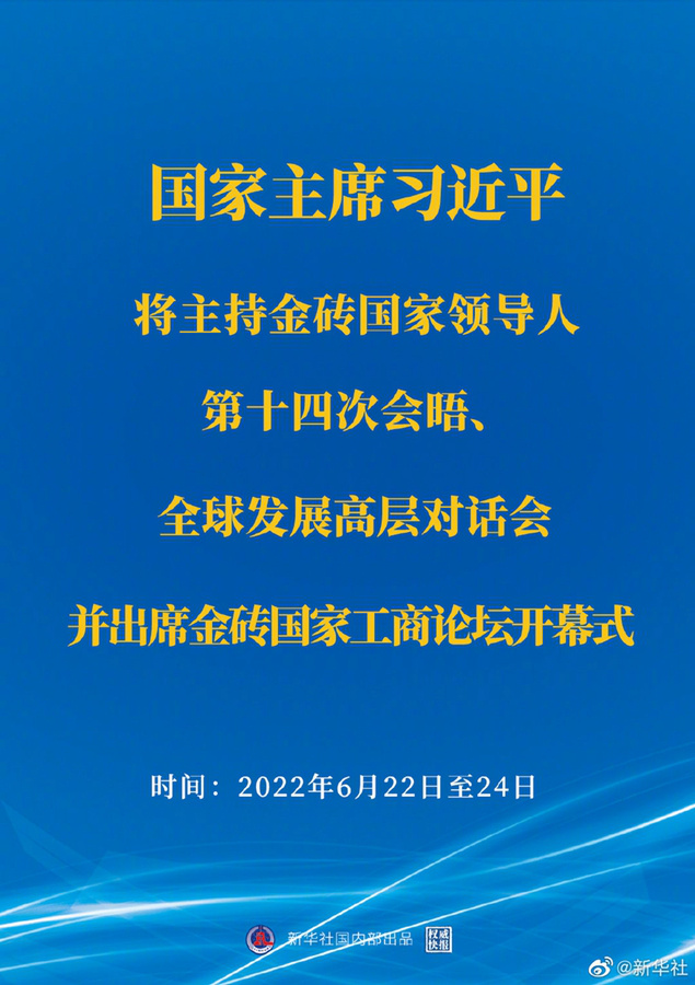 习近平主席将于6月22日以视频方式出席金砖国家工商论坛开幕式并发表主旨演讲。