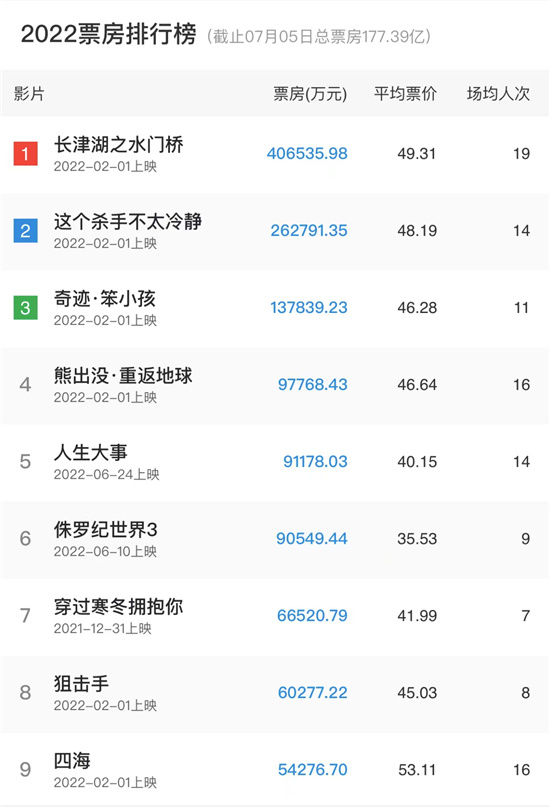 影片已超过《侏罗纪世界3》,正式跻身2022年票房前五,前四名均来自2022春节档影片,分别为《长津湖之水门桥》《这个杀手不太冷静》《奇迹·笨小孩》《熊出没·重返地球》。