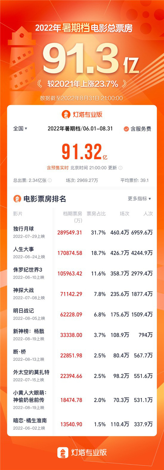 2022年暑期档不负众望,圆满收官。根据公开数据显示,截至发稿,2022年暑期档总票房已达91.3亿元,超越去年同期的73.81亿元。其中,《独行月球》、《人生大事》、《侏罗纪世界3》,分别以28.95亿元、17.08亿元、10.59亿元,位居档期单片票房排行榜前三甲。